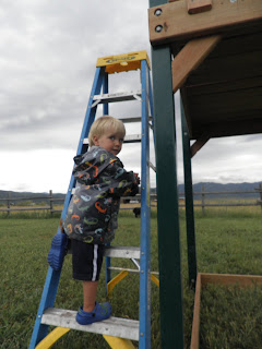 Day 2 of building the PLAYset....during the rain...Whitty learned to climb the ladder and proceeded to do it 1,000 times...he loved it.